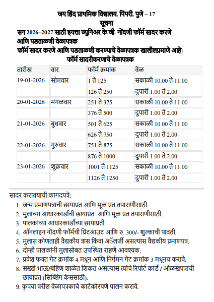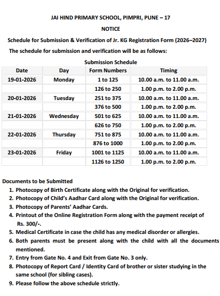 Online Admission Notice Submission & Verification of Jr. K.G. Registration Form ( 2026–2027) Jr. K.G. Admission 2026-2027