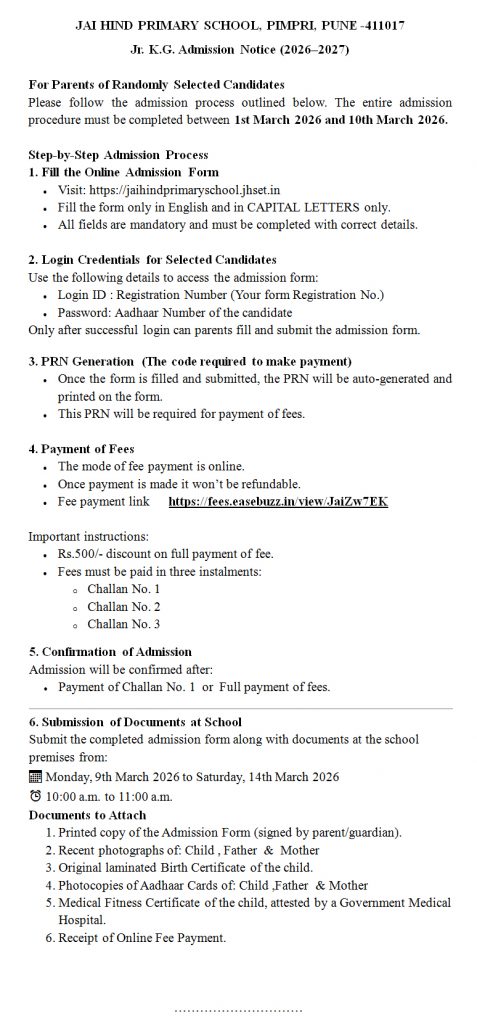 Online Admission Notice Admission Process For Parents of Randomly Selected Candidates Change in Submission and Verification of Jr.K.G. Registration form Timing Random Selection Date Submission & Verification of Jr. K.G. Registration Form ( 2026–2027) Jr. K.G. Admission 2026-2027